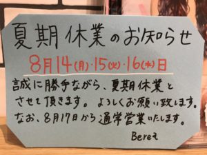 8月14.15.16日がお休みになります