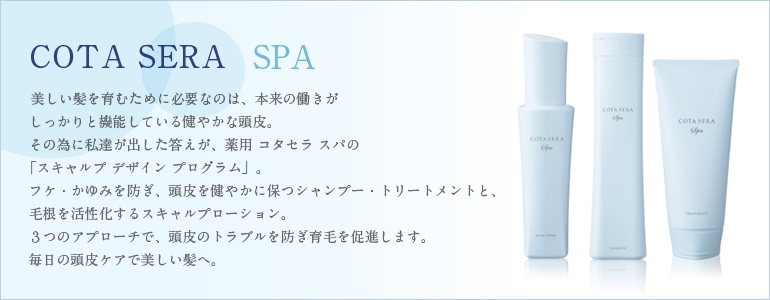 COTA SERA Spaでは、赤ちゃんにでも使えるという優しいシャンプーになっており、髪の毛のお悩み原因の約40%は頭皮のトラブルです。そこで生まれたのが「薬用」COTA SERA Spa。「薬用」だからこそ頭皮から始める上質のヘアケアが実現できるのです。フケやかゆみを防ぎ、髪と頭皮を健やかに保つシャンプー・トリートメントと毛根を活性化するスキャルプローション。この3つで頭皮トラブルを防ぎ、育毛を促進します。