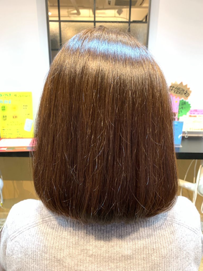 こちらの方は、くせ毛でパサパサしやすい髪質なんですが、質感がとても軽い仕上がりの「CMCリペア」で、クセの落ち着きもとても良い感じに仕上がりました。