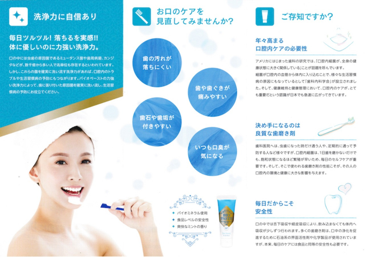 バイオペーストの強力な洗浄力によって、歯にこびり付いた菌や汚れを確実に洗い流すことで、生活習慣病の予防にお役立てください。