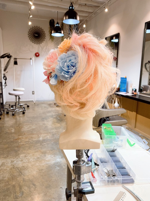 お花の髪飾りを付けて印象のあるスタイルに仕上げてるので、前は少し落ち着いた印象にしてるのですが