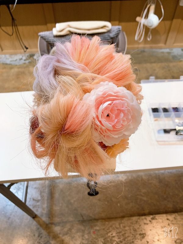 大きめのお花の髪飾りで目を引くスタイルに仕上げております。