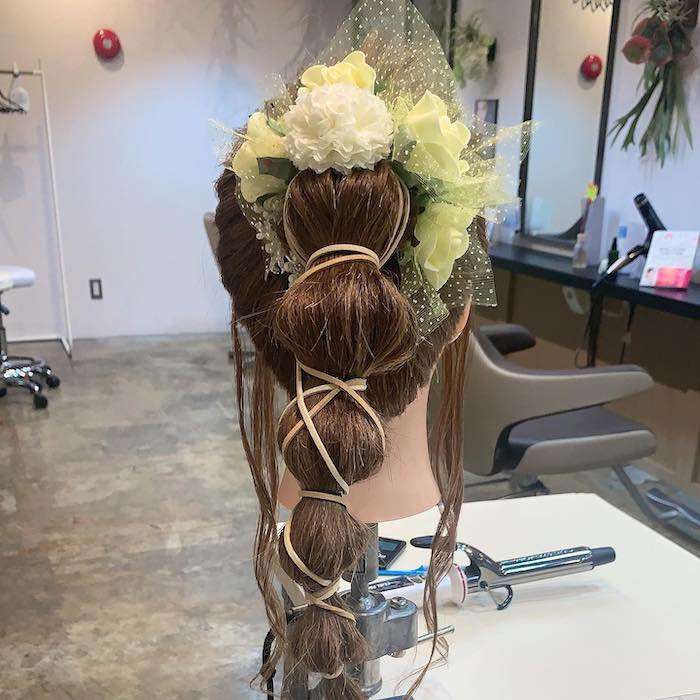 後ろで高い位置にポニーテールを作り毛束をポンポンポンっと丸く結んで小さい玉ねぎを作りワイヤーポニーを巻いて